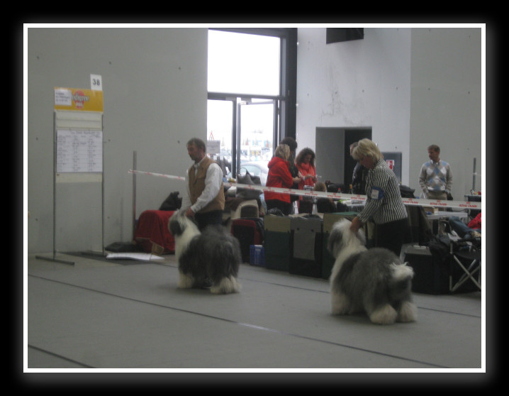 2 Jahre alte gut proportionierte Hündin, kräftiges Vorgesicht, vollständiges Gebiss mit zwei Zähnen Zange, schöne große Nase, zwei dunkle, rundum gut pigmentierte Augen, kräftiger Schädel, das Ohr sollte flacher getragen werden, guter Körper, genügend in der Vorbrust, gute Winkelungen, gute Fellstruktur, geht mit viel Schub durch den Ring, ist von hinten gesehen leicht hackeneng |